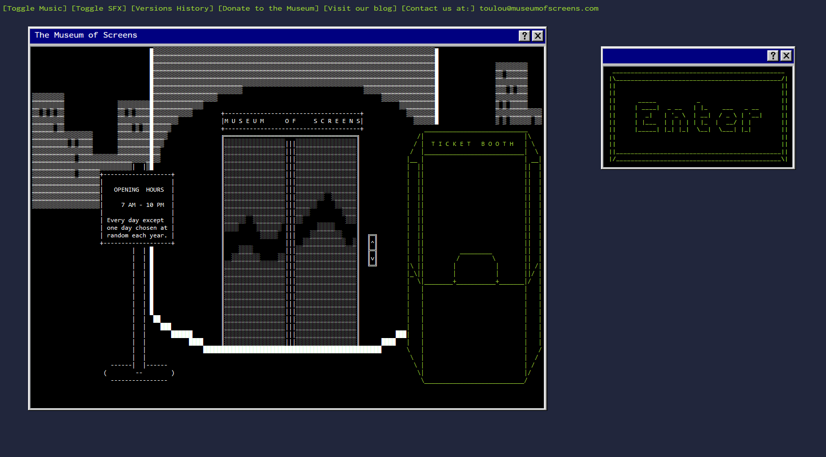 The Museum of Screens is an interactive exhibition on the history of web games. The player can explore the museum at their own pace, looking at the permanent and temporary exhibitions about the history of web games. There are also several interactive activities, a gift shop and secrets to discover.