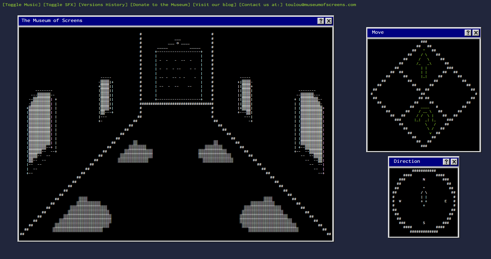 The virtual exhibition started as a side project. I wanted to make a fake computer interface with ASCII graphics, to make a pseudo-3D mazes. It evolved over time, with better graphics, improved performances and more content updated regularly.